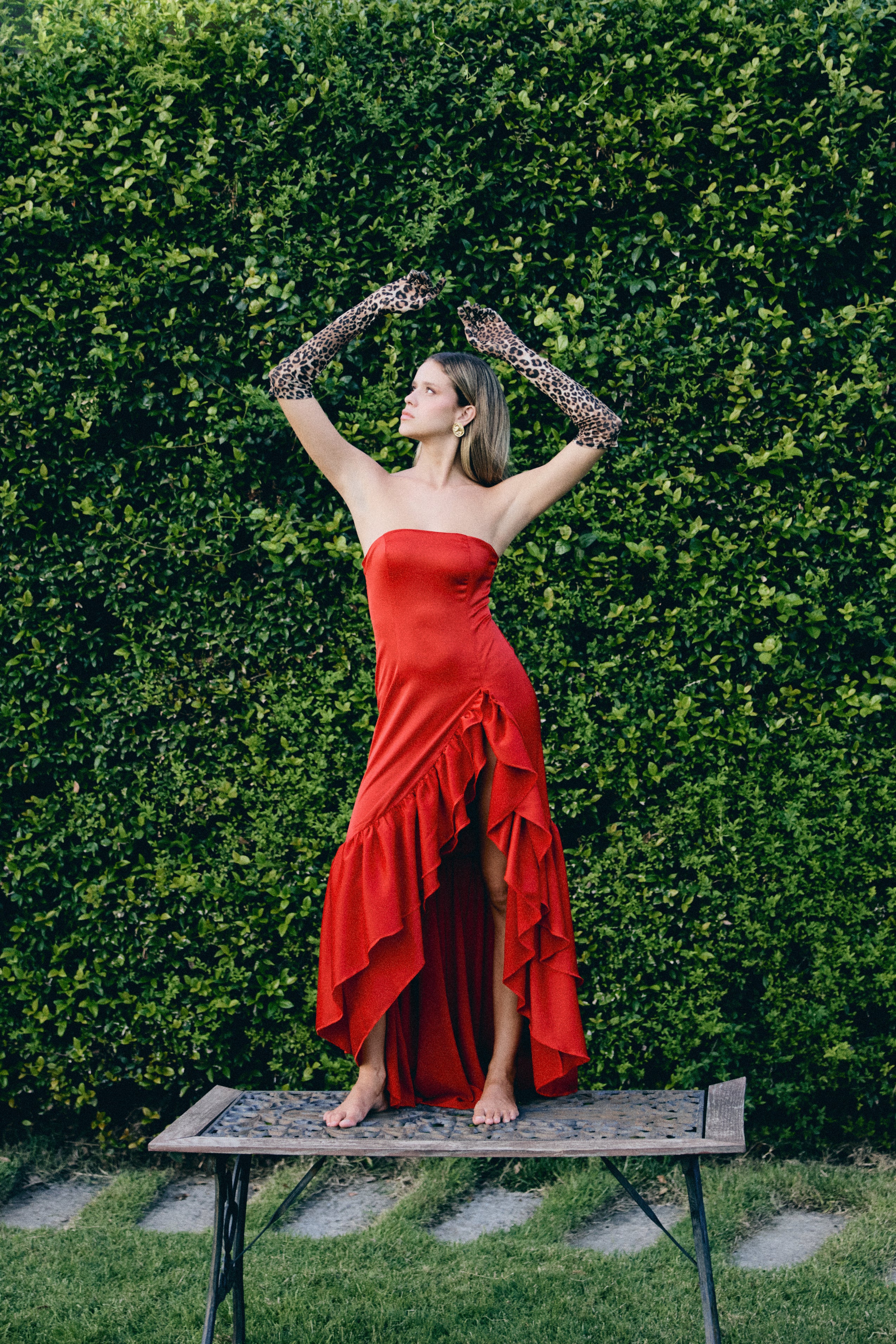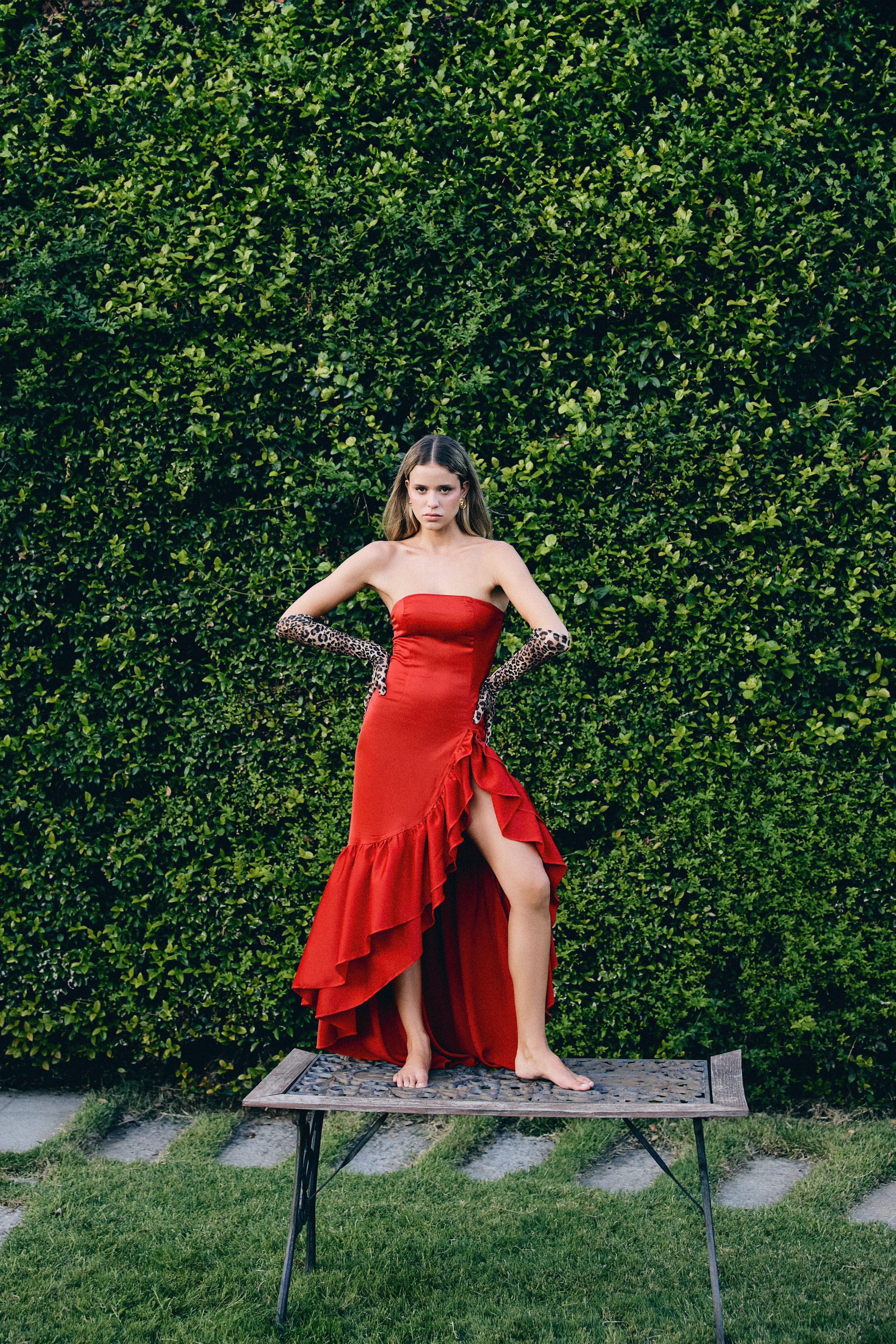 Detaylar: Straplez üst, asimetrik volanlı etek, yüksek yırtmaç