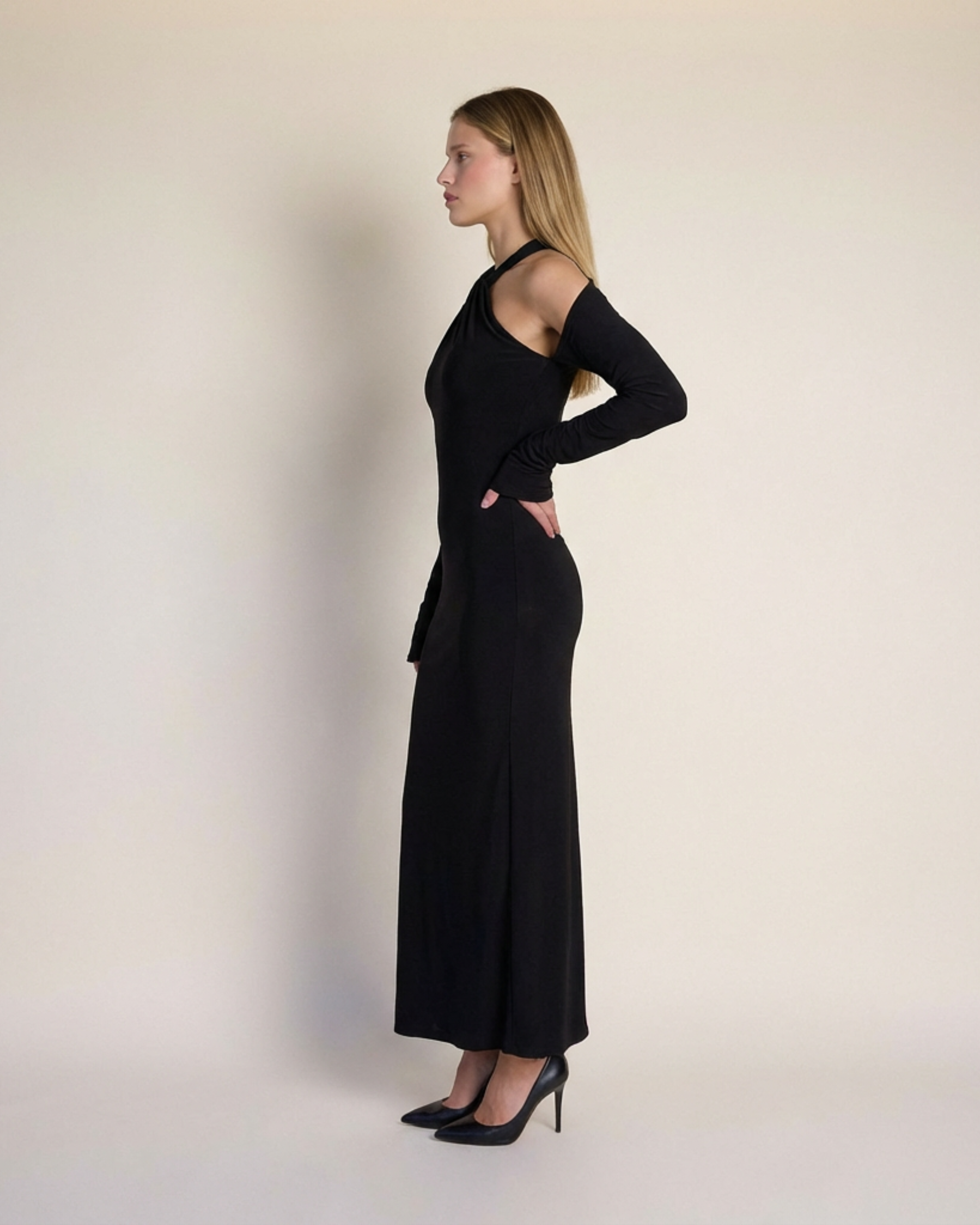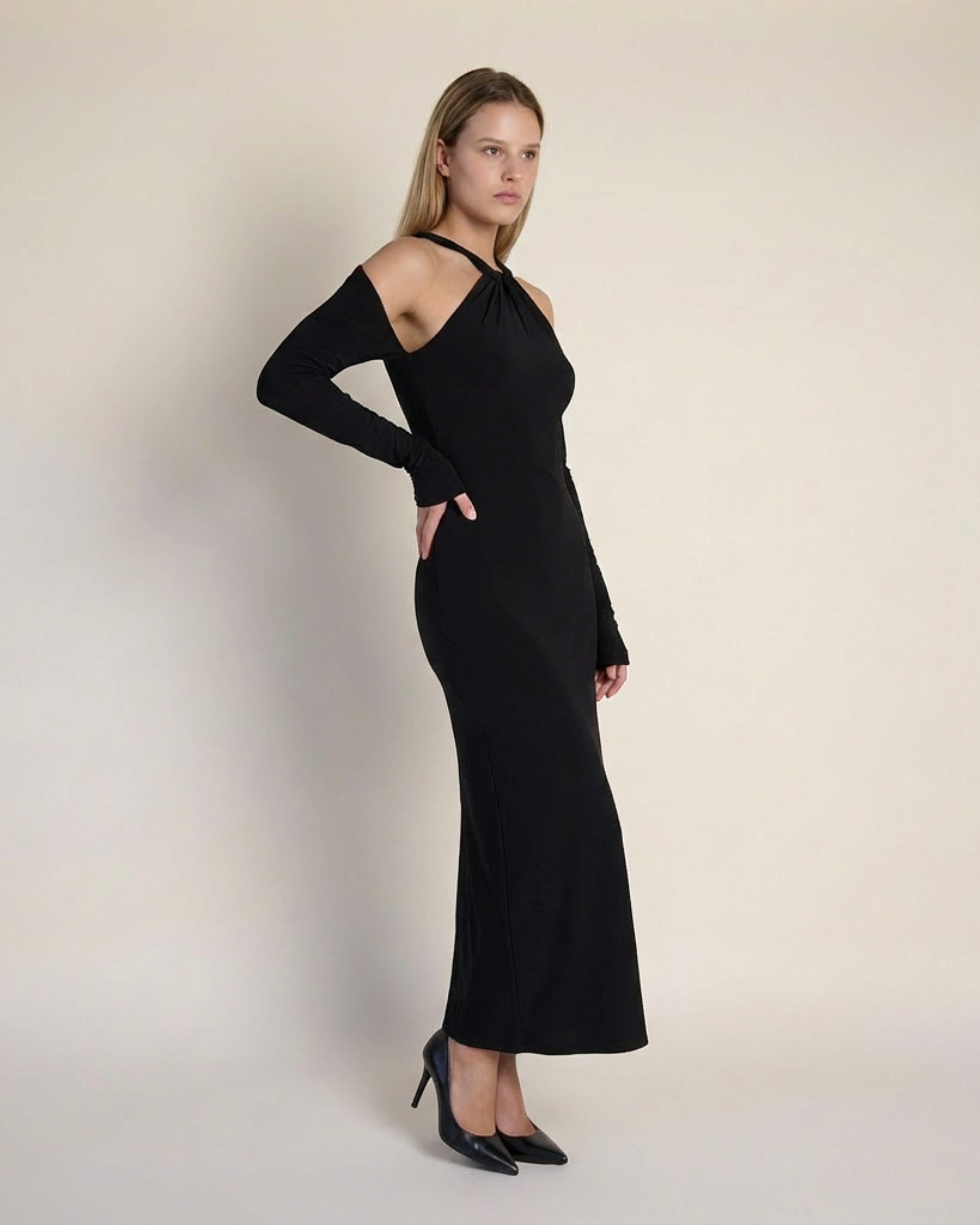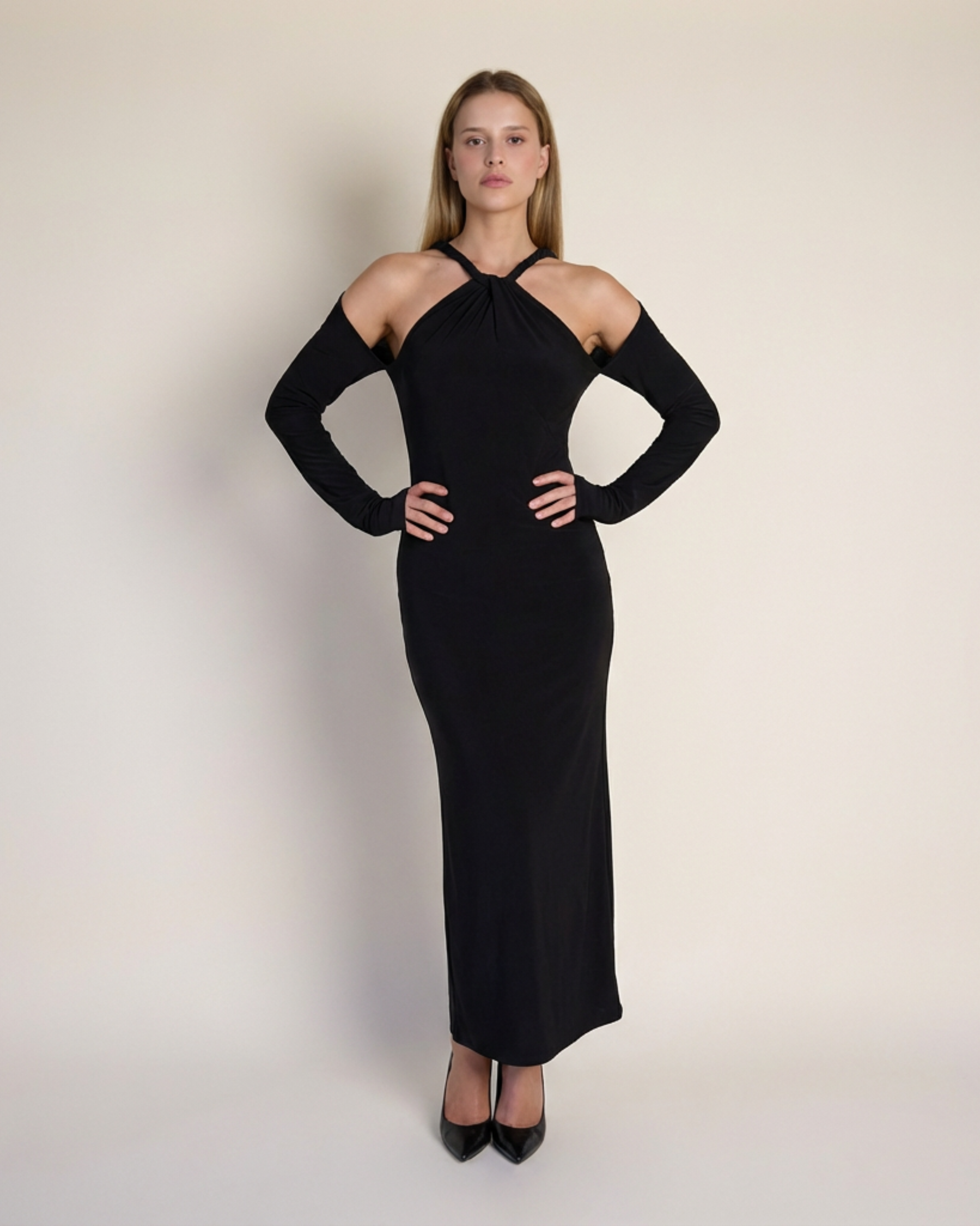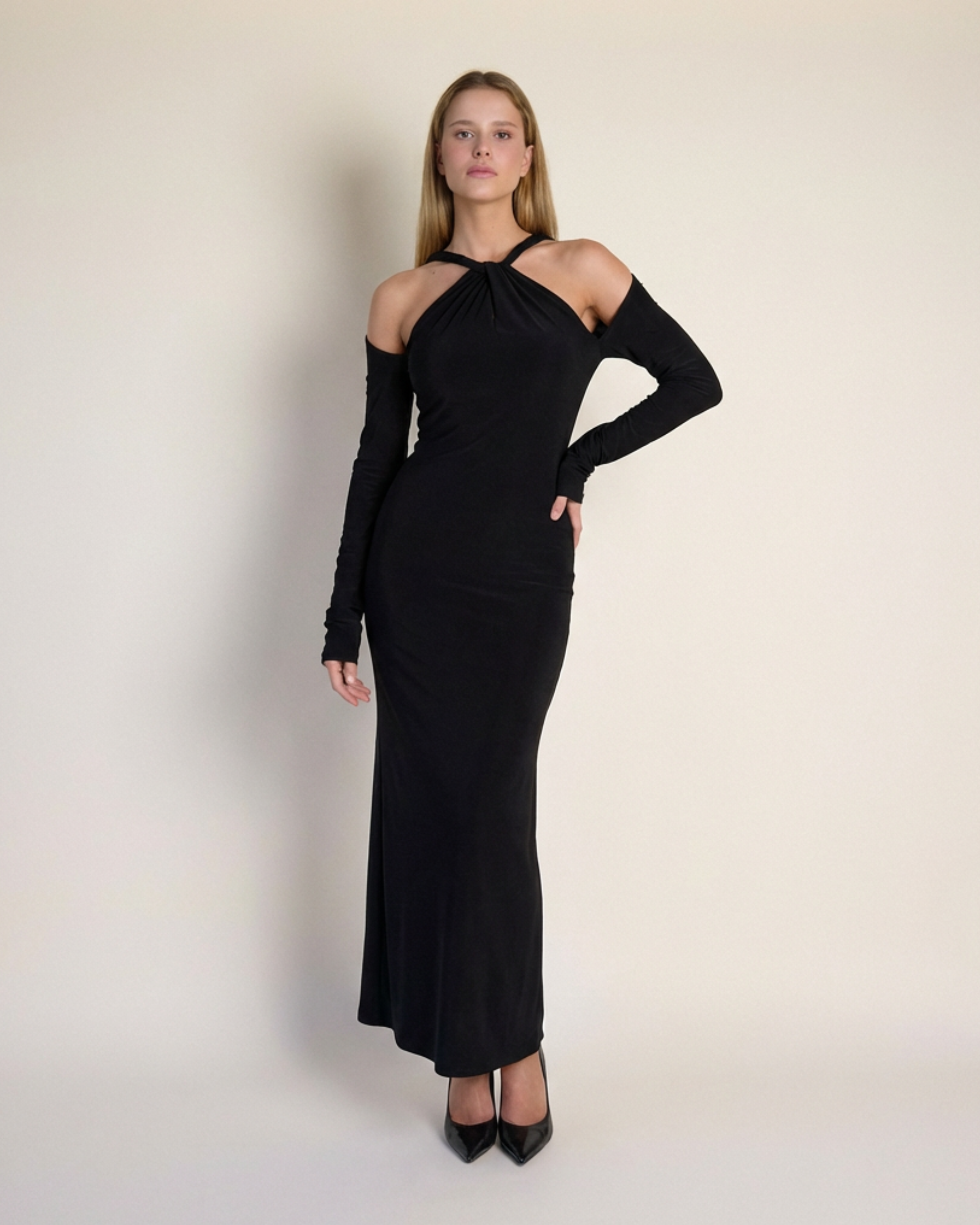 Detaylar: Burgu yaka, omuzları açık uzun kol, vücuda oturan üst beden, düz maxi etek