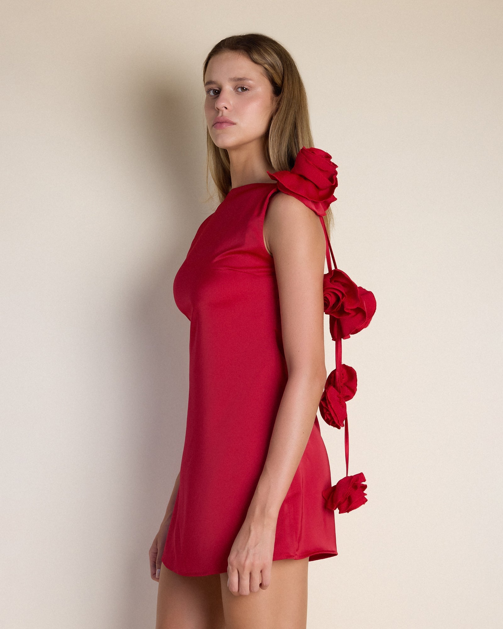 Lior Mini Elbise, sade önden görünümü ve temiz hatlarıyla modern bir zarafet sunarken, arkadaki derin sırt kesimi ve omuzdan aşağı doğru uzanan üç boyutlu çiçek detaylarıyla güçlü bir karakter kazanır. Hafif yapısı ve rahat kesimi sayesinde özel davetlerden yaz akşamlarına kadar birçok ortamda hem şık hem de konforlu bir seçenek oluşturur.