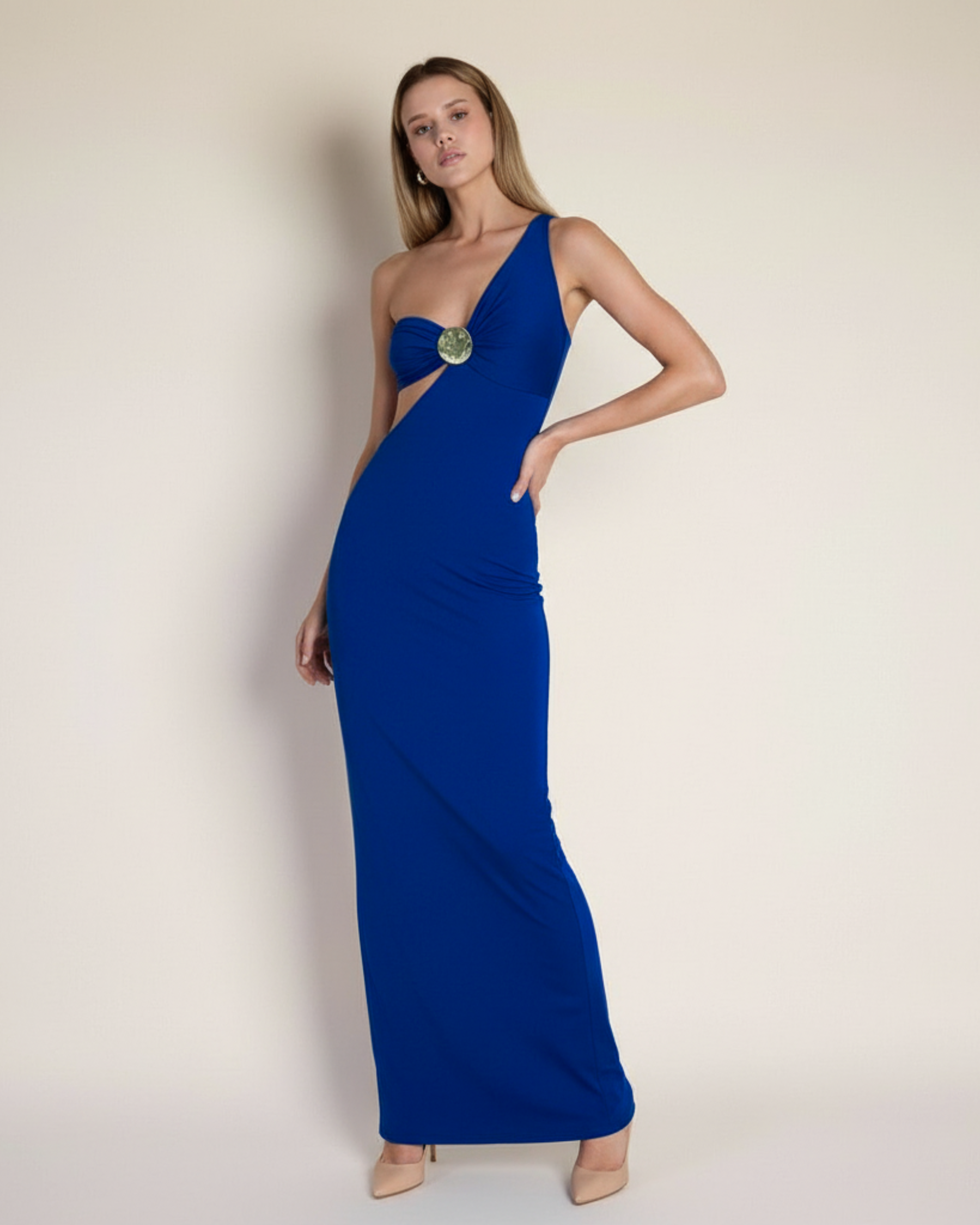 Luna Maxi Elbise, tek omuz tasarımı ve ortadaki altın aksesuarıyla modern ve dikkat çekici bir görünüm sunar. Göğüs kısmındaki kesim detayı ve vücudu saran akıcı sandy kumaş, özellikle akşam davetleri ve özel kutlamalarda şık ve dengeli bir duruş elde etmenize yardımcı olur.